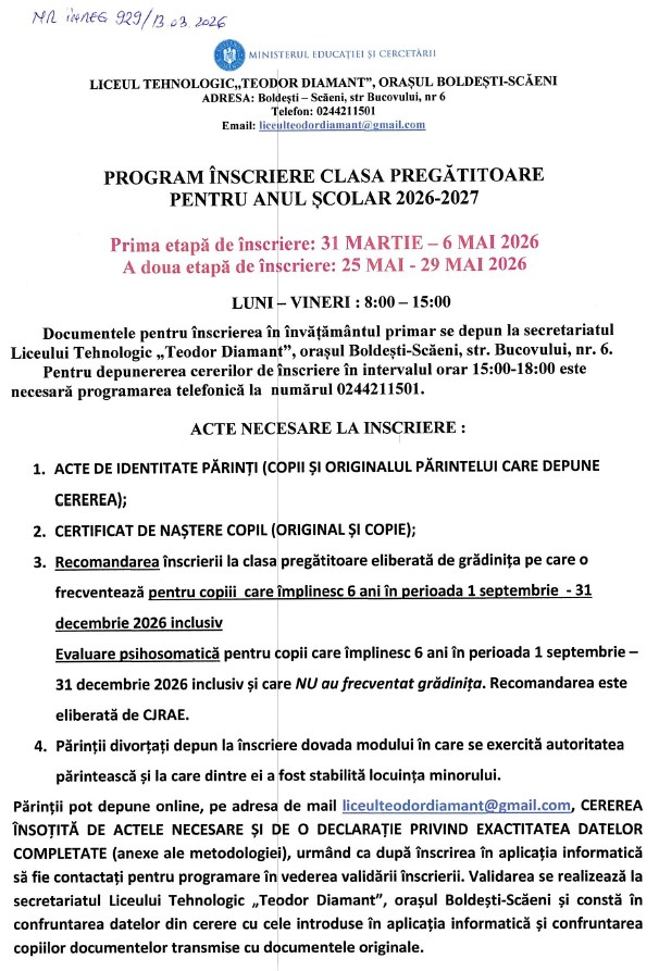 de la Liceul Tehnologic ”Teodor Diamant” Boldești-Scăeni pentru anul școlar 2026-2027 la data de 8.04.2026